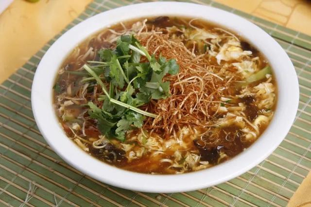 胡辣汤一般汤清、点醋、胡椒味重,佐以手洗面筋、牛羊肉、粉条、木耳丝、黄花菜、牛油等。