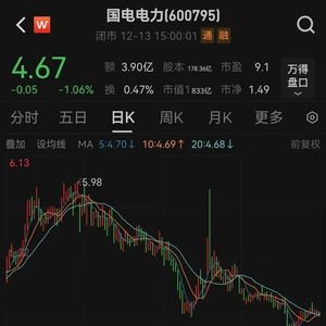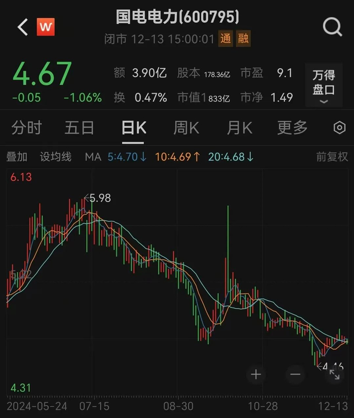 12月13日,国电电力股价以4.67元报收,最新市值为833亿元。