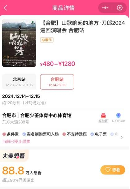 在大麦网上,刀郎的名字始终在热搜榜高位。截至发稿,演唱会北京站的“想看人数”达到51万,14-15日开场的合肥站更是达到88万,其火爆程度让许多热衷于看演唱会的年轻人大为震惊。