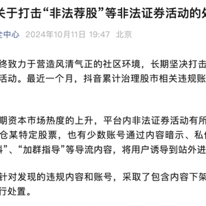 10月11日,抖音安全中心发布公告表示,抖音始终致力于营造风清气正的社区环境,长期坚决打击包括“非法荐股”在内的各类非法证券活动。最近一个月,抖音累计治理股市相关违规账号3600余个、违规内容15000余条。