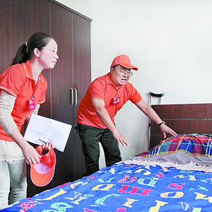 志愿者帮养老院的老人整理床铺 资料图片