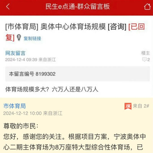 12月12日,有网友在“民生e点通”向宁波市体育局提问“奥体中心体育场规模多大?六万人还是八万人?”得到宁波市体育局的官方回复——