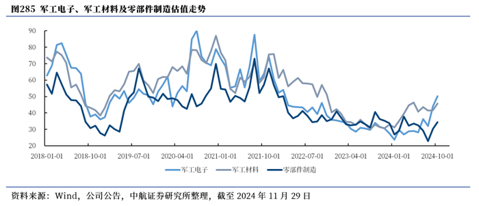 典型的军工材料、军工电子及零部件加工行业,取2018年以来各领域上市企业估值中位数进行观察,自2020年估值中枢逐步下移,各板块估值中枢接近2019年低位后受益市场情绪改善迅速提升,但仍低于2020-2021年平均水平。