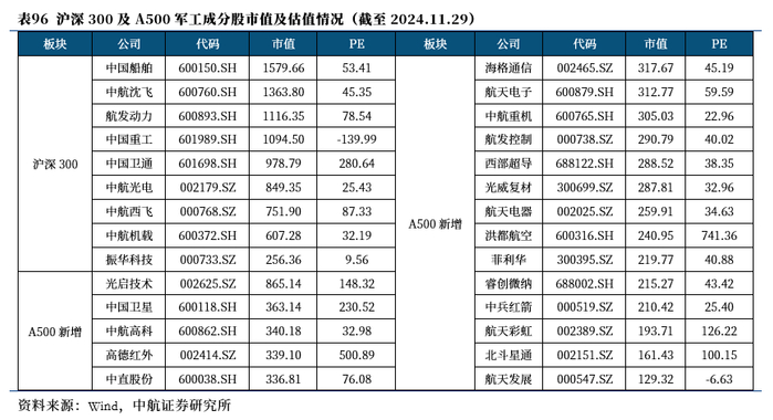 塑权重:A500的发行有助于市场对于军工优质成分股的价值发现,把握国防科技发展带来的优质投资机会。沪深300及A500均选择各行业较为优质的权重成分股,沪深300则主要关注规模大、流动性好的最具代表性的300只证券,以股票的市值规模为主要考量,新发的A500指数与沪深300指数在行业分布上有显著差异,A500更注重行业均衡分布,具体来说,A500主要面向新质生产力领域,如国防军工、电力设备、电子及医药等行业。从细分行业及产业链层级来看,新发A500中的成分股从下游整装为主扩展到了全产业链,在主机厂的基础上丰富了军工电子、军工材料、加工制造、军工信息化等多个领域,从赛道规模看,成分股从传统的军工行业扩容到低空经济、商业航天等大军工板块。后续市场流动性的逐步充盈将助推优质军工成分股市场地位的进一步提升。