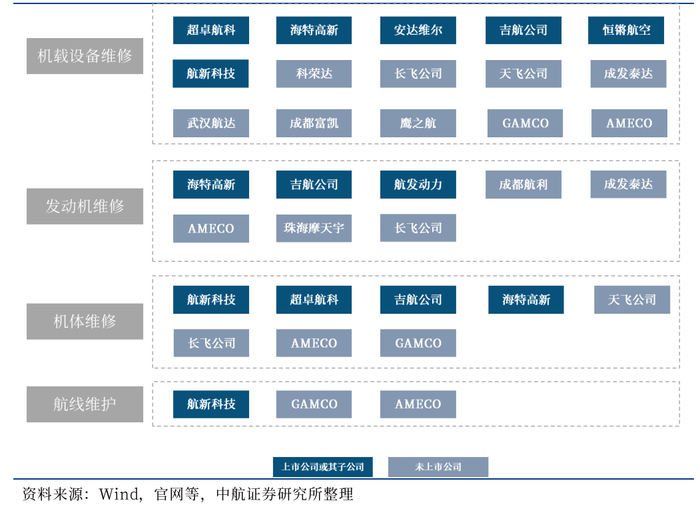 参与航空装备维修市场的上市公司主要包括中航沈飞控股子公司吉航公司拥有较为全面的军机维修能力,航发动力主要以航空发动机维修为主,以机体结构修复再制造和机载设备维修为主的超卓航科,业务涵盖机载设备维修的安达维尔,以部件维修与整机维修为主的航新科技,涵盖发动机维修、机载设备维修、飞机大修的海特高新,主要从事机载设备维修的恒锵航空。客户主要为我国军方单位及其下属的飞机大修厂、军工集团下属单位以及国内商业航空运营商。