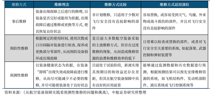 军用航空装备通常有2/3的寿命是通过修理而实现的,涉及细分领域较多,飞机上的不同系统、部件和组件,应根据其故障频率及对飞行安全的影响,分别选择合适的维修模式和维修策略。一般而言,军用飞机寿命约为25-35年,6-10年会进入大修阶段,期间的维修活动主要包括整机大修、损伤修理、附件维修与快速修理、老旧飞机持续保障、修理建线等;按照修理对象的不同,可以分为机体维修、机载设备维修、发动机维修以及航线维护;按照维修理念和方式又可以分为事后维修、预防性维修,以及预测性维修。