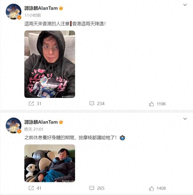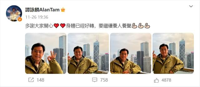 11月26日,谭咏麟在社交平台发布照片,回应众多粉丝的关心。