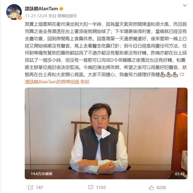 据悉,今年11月23日,谭咏麟曾因病取消了原定在惠州的演唱会。起因是在衢州演出时,天气突然降温,而他在舞台上依旧全情投入,跳舞、唱歌,汗水浸湿了衣衫。在外冷内热的刺激下,谭咏麟生病了,咳嗽不止。
