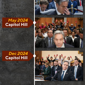 2024年5月21日,布林肯出席在国会参议院外交关系委员会举行的预算听证会。布林肯刚步入会议房间,多名与会者站起来同时高举涂满红漆的双手,以示对拜登政府在本轮巴以冲突中力挺以色列的不满,“他的手上沾满了4万巴勒斯坦人的鲜血,”抗议者喊道,“停止种族灭绝!停止大屠杀!”