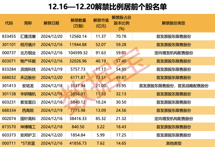 其中,汇隆活塞、明月镜片、北方铜业、物产环能、灵鸽科技解禁比例排名前五,依次为70.78%、59.28%、59.01%、57.4%、54.95%。上述5股中,除了北方铜业为定向增发机构配售股份解禁,其余解禁股类型均为首发原股东限售股份解禁。