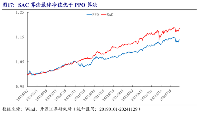 对于PPO和SAC两种算法,优选风格样本外的日度超额净值如图17所示,SAC算法的效果优于PPO算法。
