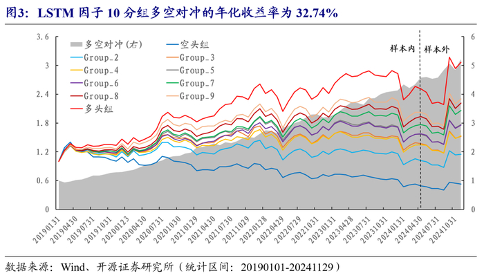 在《深度学习赋能交易行为因子》中,我们从最基本的行情和财务数据出发,讨论了LSTM模型在因子挖掘中的应用,模型的架构如图2,绩效如图3所示。从20190101至20241129,LSTM因子的月度RankIC均值为9.37%,RankICIR为3.86。10分组多空对冲的年化收益率为32.74%,月度最大回撤为4.26%,月度胜率82.86%。