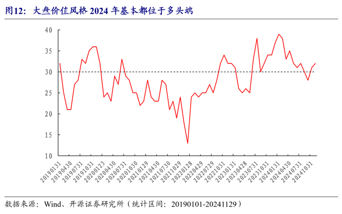 为了更直观地体现绝对比例的风格选择能力,我们以2024年表现较好的大盘价值风格为例,观察其绝对比例的截面排名,结果如图12所示。从图中我们可以看出,从2023年下半年以来,该风格的排名显著上升,基本都位于多头端。(注:这里大盘价值和Wind编制的大盘价值不一样,这里的选股范围相对更宽)