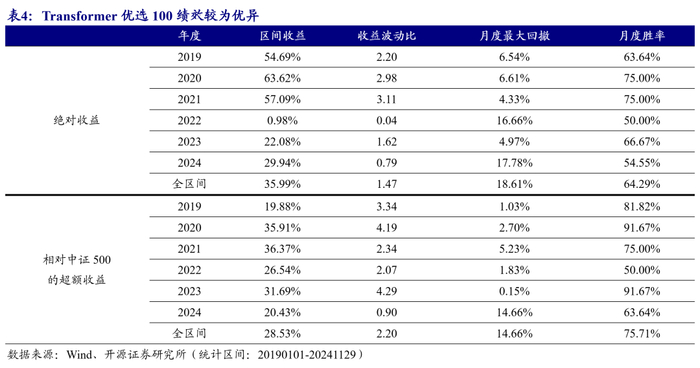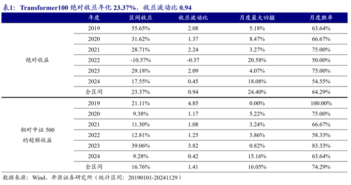 从20190101至20241129,Transformer优选100绝对年化收益35.99%,收益波动比1.47,超额年化收益28.53%,超额收益波动比2.2。