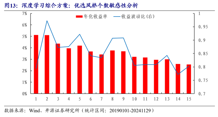进一步,我们将指数因子维度和股票因子维度相结合。其中,指数因子维度空头端负向剔除能力突出,股票因子维度多头端优选能力突出,因此我们采取如下方案:首先使用指数Tramsformer因子剔除排名后1/4的风格,再在剩下的风格指数池中利用股票Tramsformer因子聚合至指数的绝对比例优选N个风格。随着N的增加,年化收益和收益波动比的敏感性分析如图13所示。