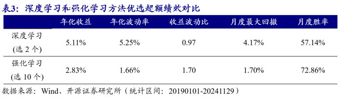 通过测算我们发现,深度学习方法在极端多头处效果较好,最终选取2个风格;强化学习方法在极端多头处虽然年化收益还可以,但是波动较大导致收益波动比较低,最终选取10个风格。两种方式下的超额风格等权的绩效对比如表3所示。