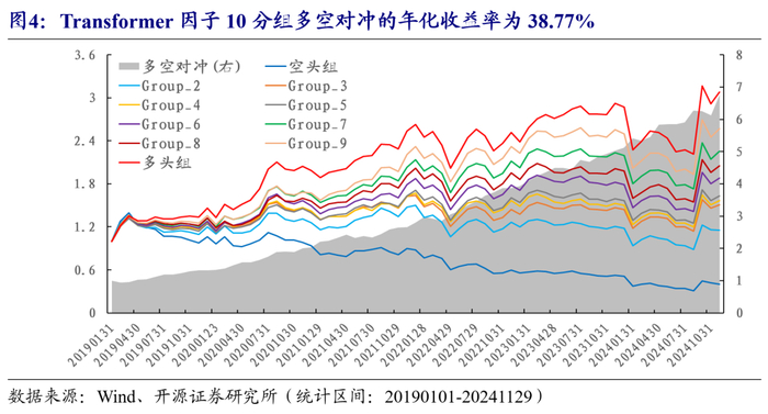 从20190101至20241129,Transformer因子的月度RankIC均值为10.27%,RankICIR为4.35。10分组多空对冲的年化收益率为38.77%,月度最大回撤为4.46%,月度胜率为81.43%。相较于LSTM因子而言,整体的绩效有一定程度的提升,RankIC从9.37%提升至10.27%。