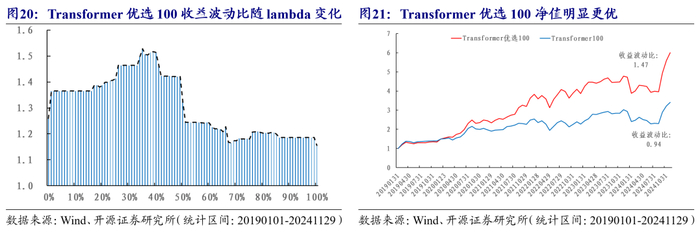 在上述的步骤中,存在参数lambda,我们对其进行参数敏感性分析,在0~1的变化过程中,Transformer优选100的收益波动比变化如图20所示。从图20中我们可以看出lambda在0.2~0.5存在相对较稳定的平台域,最终选择lambda为1/3。Transformer优选100与Transformer100的净值对比如图21所示,收益波动比从0.94提升至1.47。