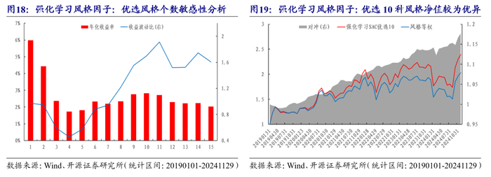 进一步地,对于N=20的月度强化学习风格SAC因子,我们测试了不同风格优选个数下的年化收益和收益波动比。由于深度学习中指数Transformer因子空头负向剔除效果较好,所以这里在优选时也首先将指数Tramsformer因子排名后1/4的风格剔除,具体情况如图18所示。随着优选风格个数的增加,年化收益整体呈现单调递减趋势,收益波动比先下降后上升,在10左右绩效相对较优,净值曲线如图19所示。