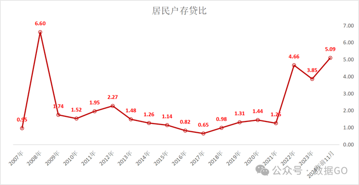 数据显示,前11月居民存款金额累计12.07万亿,是历年前11月第3高;前11月存贷比5.09,是2008年以来最高,反应了居民的谨慎心态。根据数据GO 1月15日发布的《历年居民新增存、贷款额(2005-2023)》,居民存款的增长起始于2018年(那一年7.2万亿),爆发于2022年(一年新增17.84万亿)。居民贷款快速增长起始于2016年(6.33万亿),高峰于2021年(7.92万亿),崩盘于2022年(3.83万亿)