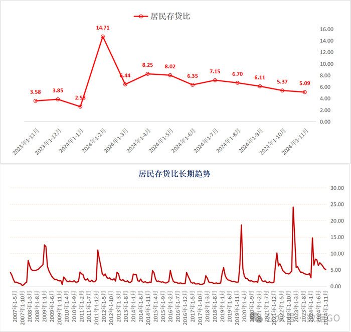 如果经济好转,居民存贷比应该还会下降,后续应该仍会看到居民信贷额度的扩张和存款金额的下降。该数据越高,说明居民可能因为一些困境而加大储蓄,减少贷款。目前前11月的存贷比略低于2008年金融危机的水平。