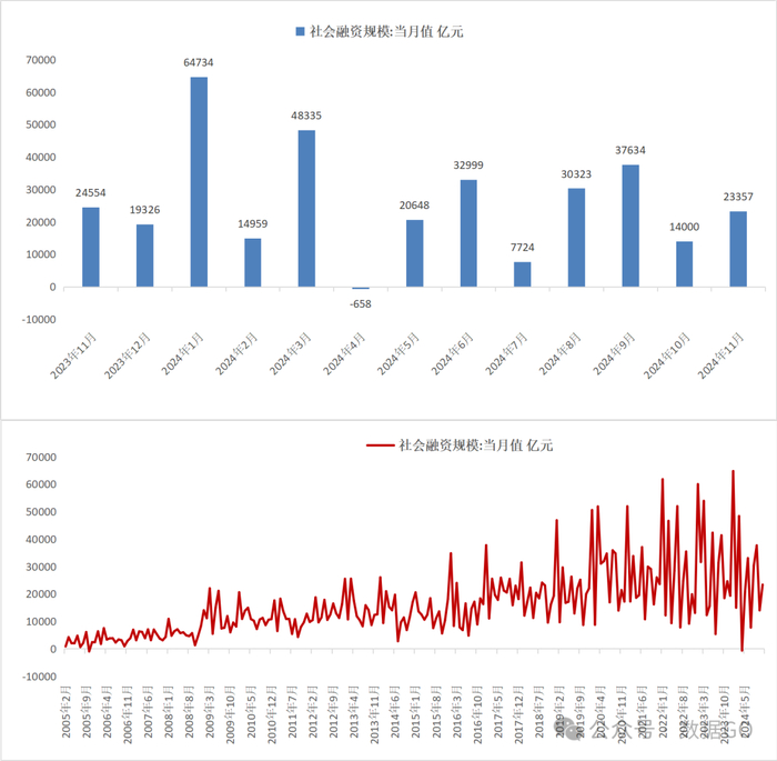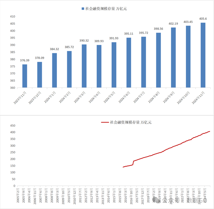 11月融新增23357亿元,环比多增9357亿元。到11月底,社融存量405.6万亿,环比增加2.15万亿,继续创新高。社融100万亿存量是2013年12月份,200万亿关口是2017年9月,300万亿关口是2021年6月,400万亿关口是2024年9月。