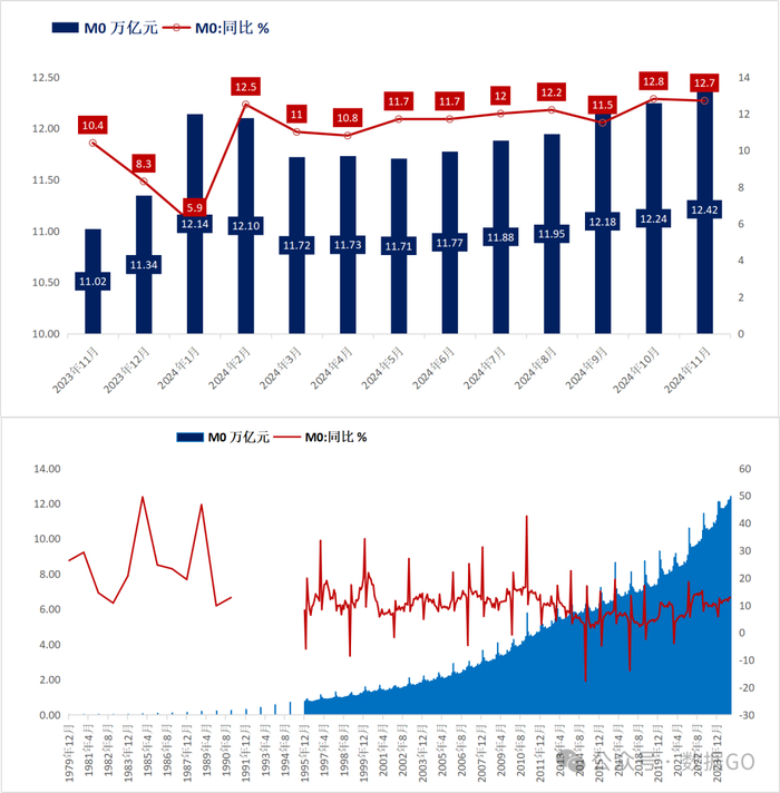 截止2024年11月底,M0余额12.42万亿,绝对值创历史新高,同比增长12.7%,增幅低于10月的12.8%