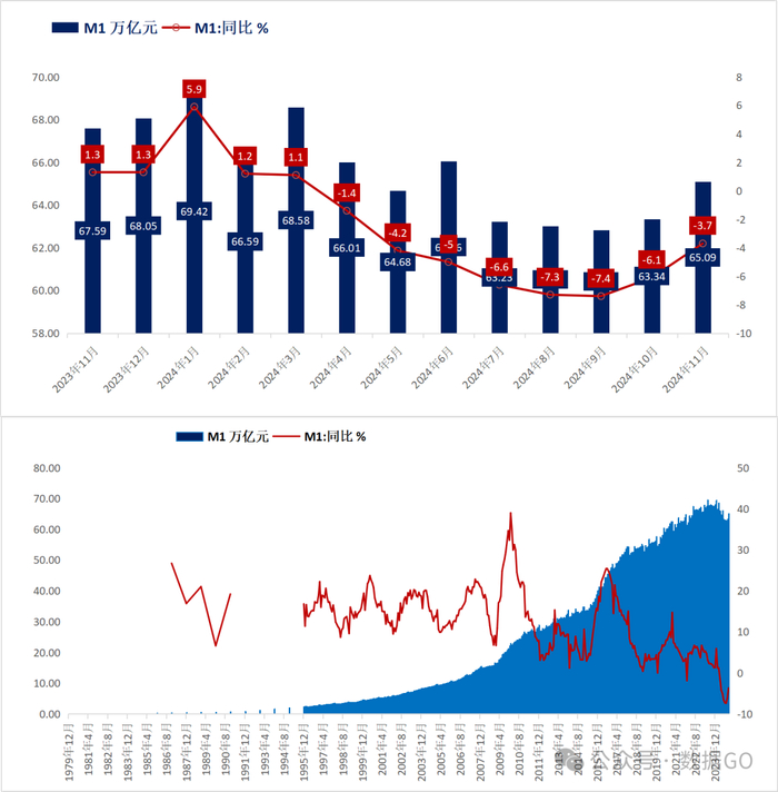 截止2024年11月底,M1余额65.09万亿,同比增长下降3.7%,降幅比10月收窄2.4个百分点,连续第8个月为负;有数据以来,历史只有8次M1下降的情况,第一次是2022年1月,其余七次就是2024年4-11月。