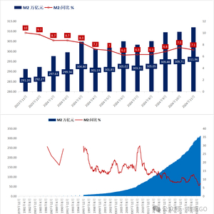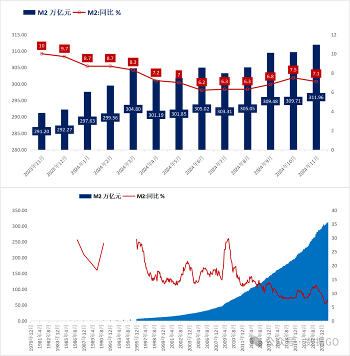 根据官方数据,截止2024年11月底,M2余额311.96万亿,绝对值创历史新高,同比增长7.1%,增幅低于10月份7.1%。根据数据GO测算,11月底M2余额环比增加2.25万亿。