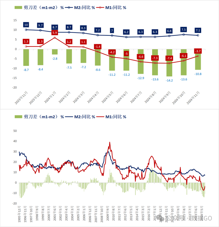 根据数据GO测算,11月份M1与M2剪刀差(M1-M2)是-10.8%,比10月收窄,之前9月是1996年4月以来最大负差值,达到了-14.2%。