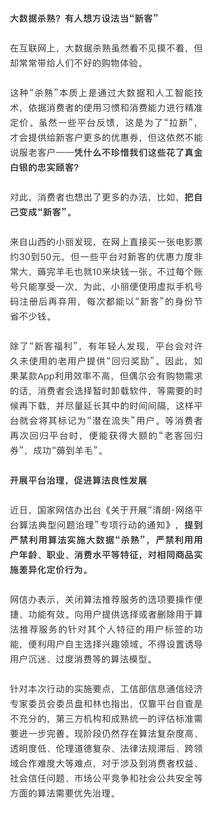 近日,不少年轻人晒出自己的攻略,分享如何对抗“越用越贵”“越看越烦”的算法。随着大众的生活越来越依赖互联网,算法也渗透到了每个环节,许多用户发现自己在不知不觉中被算法控制、被大数据杀熟,花了许多冤枉钱。近期,网信办等四部门联合发布通知,开展专项行动,治理算法典型问题。