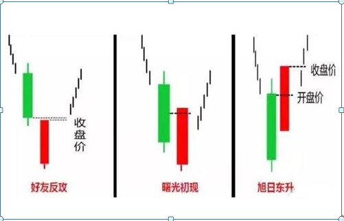 好友反攻、曙光初现、旭日东升K线形态相似,因此放在一起。三者反转信号逐个提高,在连续下行之后,出现此信号千万要注意。