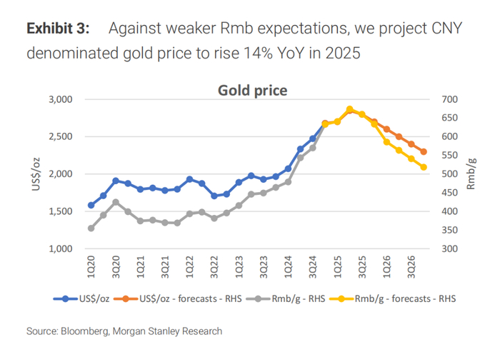 最后,是中国黄金的盈利弹性更大。大摩表示,在人民币波动的预期下,预测2025年以人民币计价的黄金价格将同比上涨14%,达到每克652元人民币的历史新高。