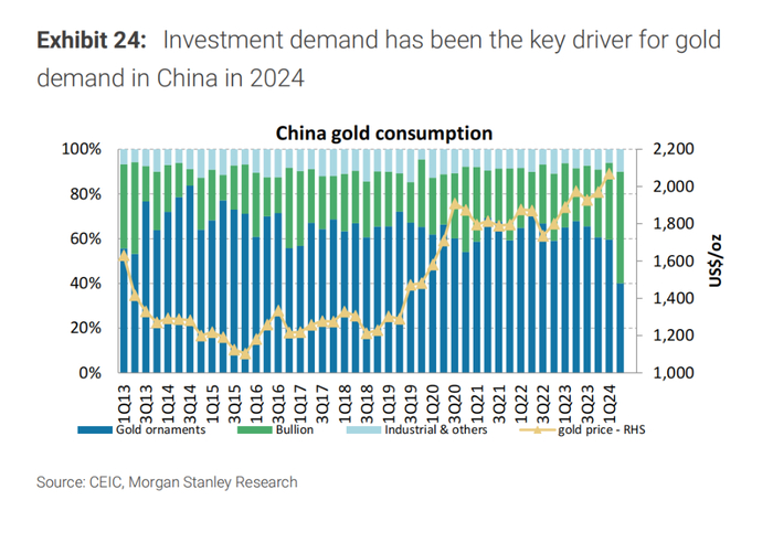 尽管今年上半年黄金珠宝的消费有所下降,但投资者的热情却高涨。大摩数据显示,上半年黄金购买量同比增长了46%,这主要得益于投资需求的强劲增长。大摩预计,今年投资需求将在黄金总消费中占比超过四成,远高于去年的水平。