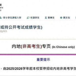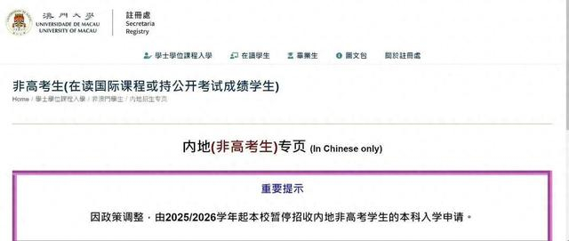 据澳门大学官网显示,因政策调整,自2025/2026学年起, 将暂停招收内地非高考学生的本科入学申请。这也意味着,凡是内地户籍学生, 将无法再通过A-Level/AP/IB等国际课程体系成绩申请澳门大学,高考成绩成了内地学生申请澳门大学的“独木桥”。