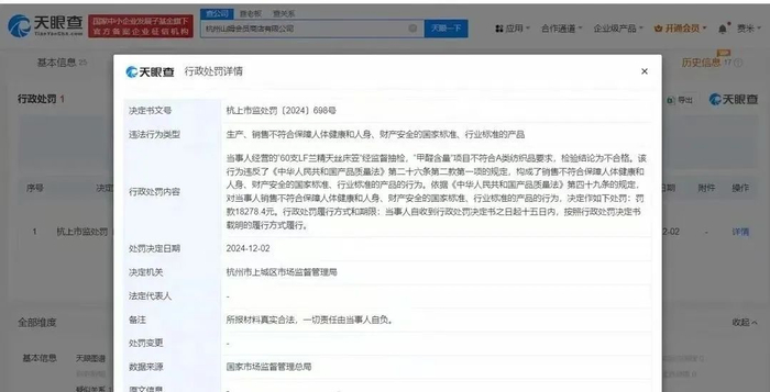处罚事由显示,当事人经营的“60支LF兰精天丝床笠”经监督抽检,“甲醛含量”项目不符合A类纺织品要求,检验结论为不合格。