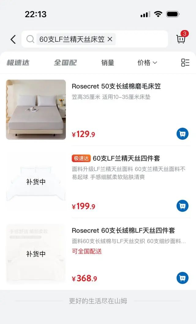 目前在山姆会员商店APP,该“60支LF兰精天丝床笠”商品显示补货中。