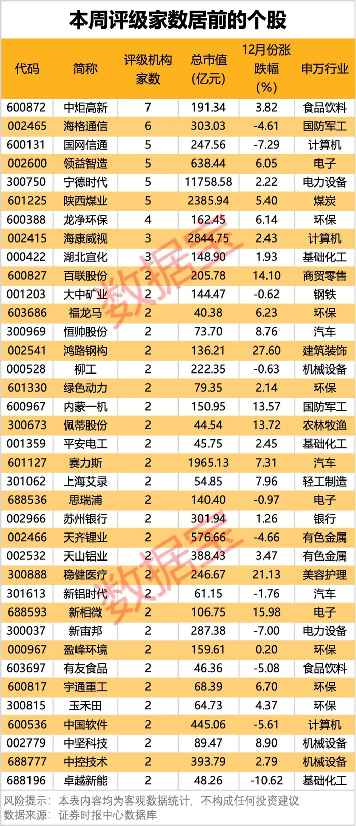 37股获2家及以上机构给予评级,机构关注度最高的是中炬高新,有7家机构评级;紧随其后的是海格通信,有6家机构评级。另外,国网信通、领益智造、宁德时代、陕西煤业均有5家机构重点关注。