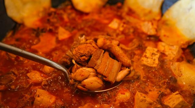 对了,还有锅边的贴饼别忘了!贴饼一面酥脆、一面软糯,吸收了汤汁后,味道更加浓郁,咬下去又脆又香,简直绝了!