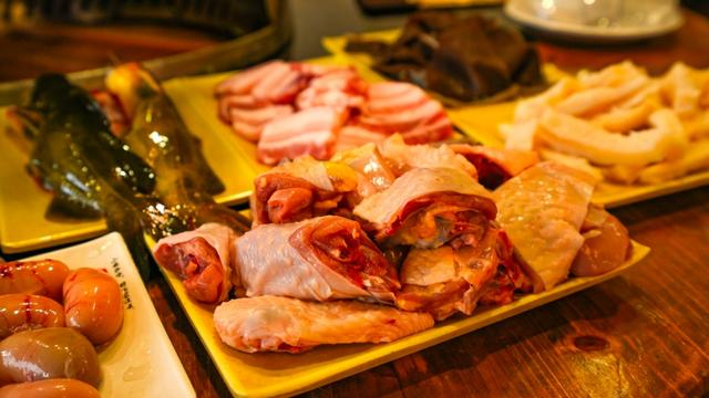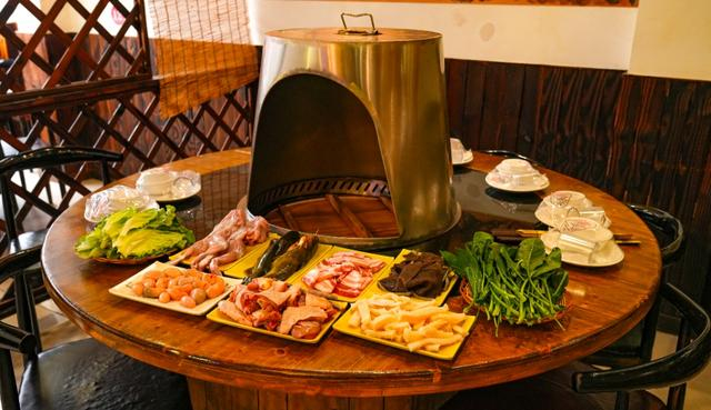 三两人围坐一桌,点上一份套餐。新鲜的五花肉、肥嫩的牛蛙、鲜美的鸡肉,还有生菜、娃娃菜、毛肚……各类新鲜食材荤素搭配,还没下锅就勾起了食欲。