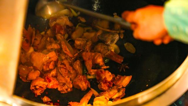 相较于一般炒菜,地锅鸡的一大特色便是食材上桌现炒。最先下锅的是五花肉,煸炒出油,随后加入牛蛙等其他食材。吃地锅鸡,鸡肉自然必不可少,新鲜的鸡肉搭配秘制酱料翻炒,不一会儿,香味便沿着大锅灶四散开来。