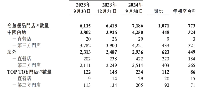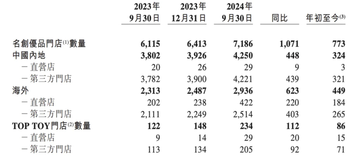 2022年,接受CNBC访谈时,叶国富透露,美国直营店月均销售额为50万美元,当年12月收入可达到月均100万美元,毛利率超50%。截至2024年9月30日,名创优品海外直营店422家,同比增加220家,仅在2024年前九个月就新建了184家。TOP TOY和中国内地在2024年新增门店也分别为15家和3家,远低于海外。