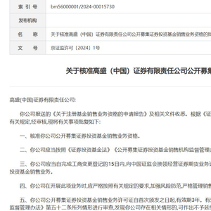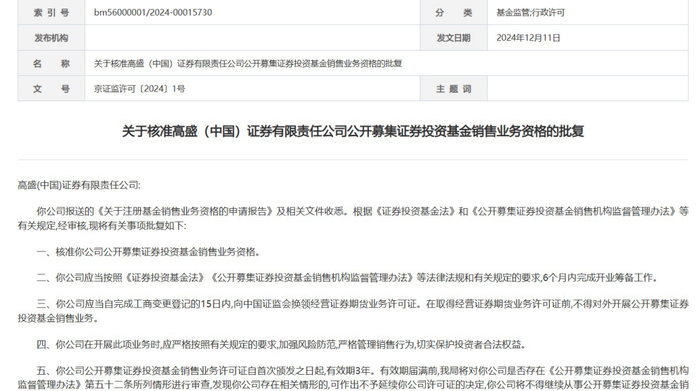 根据批复,高盛中国应当按照《证券投资基金法》《公开募集证券投资基金销售机构监督管理办法》等法律法规和有关规定的要求,6个月内完成开业筹备工作。