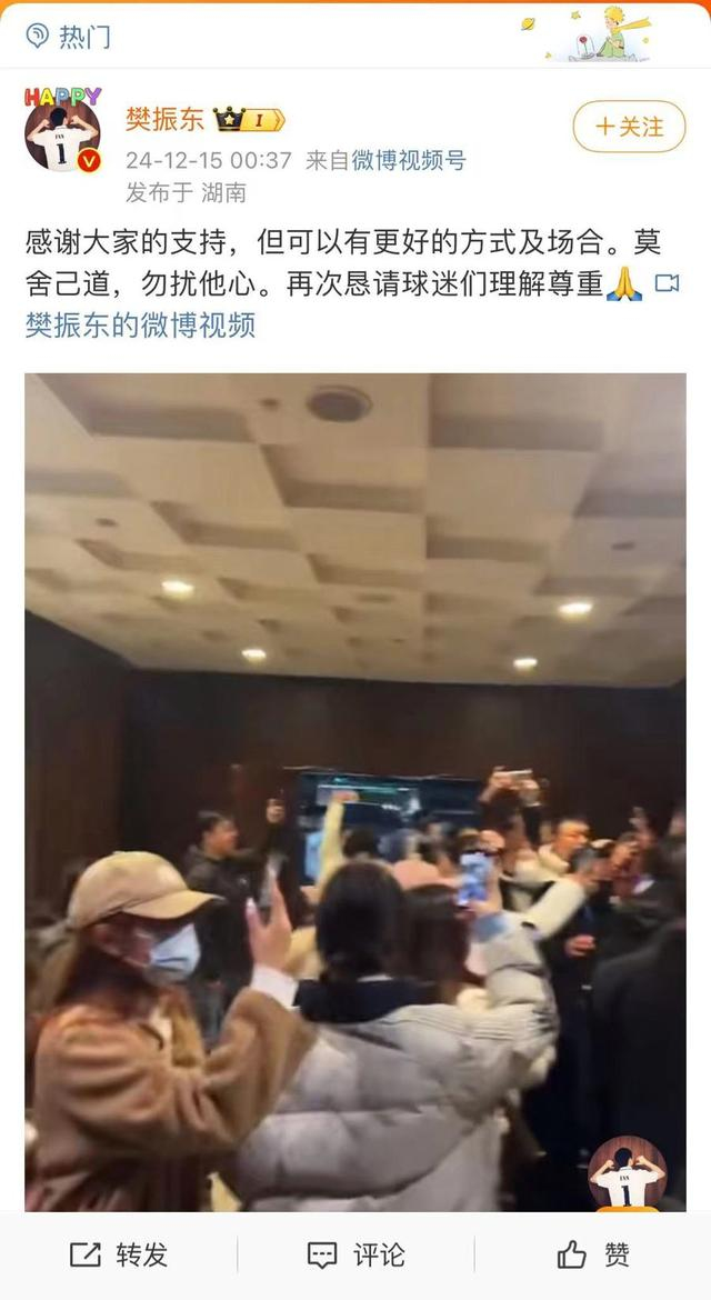 12月15日凌晨,正在长沙征战本赛季乒超联赛的上海运动员樊振东通过微博发布一段视频。在11秒的视频中,只见众多粉丝高举手机围堵在电梯厅,樊振东配文,“感谢大家的支持,但可以有更好的方式及场合。莫舍己道,勿扰他心。再次恳请球迷们理解尊重。”几句话,肺腑之言,道尽了樊振东的无奈,他以最克制的方式向球迷喊话,而笔者听到的是他发自心底的“呼救”。