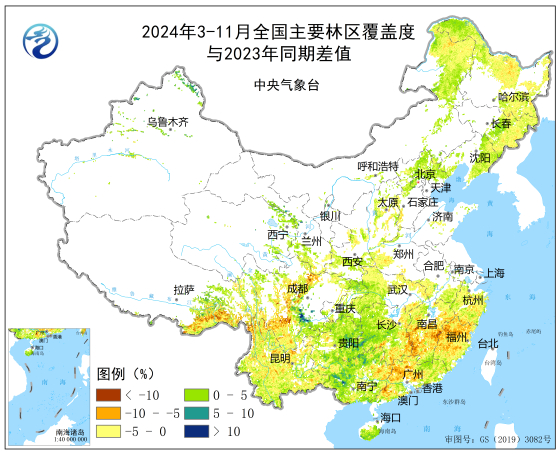图32024年3-11月全国主要林区植被覆盖度与2023年同期对比