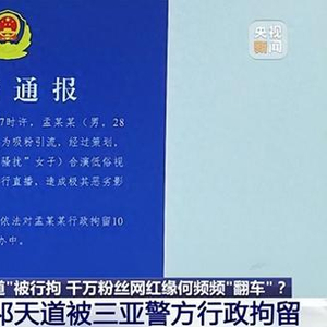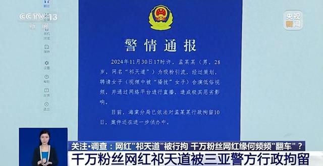 12月4日,三亚市公安局海棠分局通报:孟某某(男,28岁,网名“祁天道”)为吸粉引流,经过策划,聘请女子(视频中被“骚扰”女子)合演低俗视频,并通过网络平台进行直播,造成极其恶劣影响。海棠分局已依法对孟某某行政拘留10日,案件还在进一步侦办中。