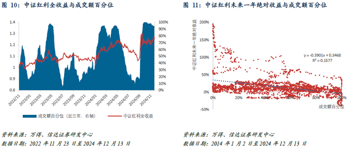 截至2024年12月13日,中证红利成交额处于近三年95.19%百分位,一个月前为98.26%百分位,成交拥挤度随市场回暖走高,带入回归方程,回归模型估计未来一年绝对收益为-2.45%。