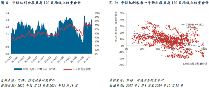 截至2024年12月13日,中证红利成分股合计78.17%权重位于半年均线以上,一个月前为71.09%,带入回归方程,回归模型估计未来一年绝对收益为2.46%。