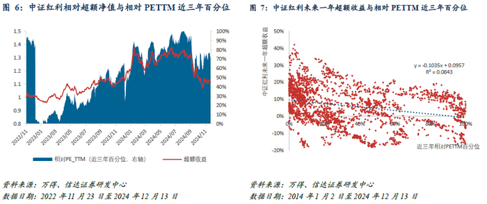 在相对PETTM层面,以中证红利PETTM估值除以万得全A PETTM估值,计算中证红利的相对估值,测算与中证红利未来一年相对万得全A超额收益的关系,两者相关性系数为-29.03%,回归T统计值为-14.90。根据估值与收益散点图,历史上,当中证红利相对PETTM处于历史低位时,有较为可观的超额收益赔率,但若相对PETTM过高,可以看到超额收益赔率逐渐下降,性价比有所降低。