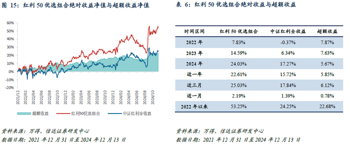 在前期报告《分域选股系列之三:红利策略宝典:从经验逻辑到可落地的增强方案》中,我们构建了红利50优选组合。组合在高股息收益的基础上,叠加线性多因子模型进一步增强组合资本利得收益,并采用Barra风格因子约束组合风格暴露。更进一步参考三维红利超额择时模型的观点,在保证大红利风格不漂移的前提下,细调红利风格暴露度,利用择时进一步增厚收益。